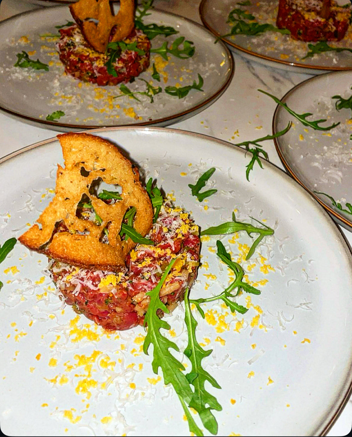 Voorgerecht: Vers met de hand gesneden tartaar van Ierse kwaliteit diamanthaas fijn gesneden garnituren zoals rode ui en groene kruiden met een huisgemaakte tartaarsaus, zuurdesem croutons, Parmezaanse kaas, rucola, gedroogde eidooier.