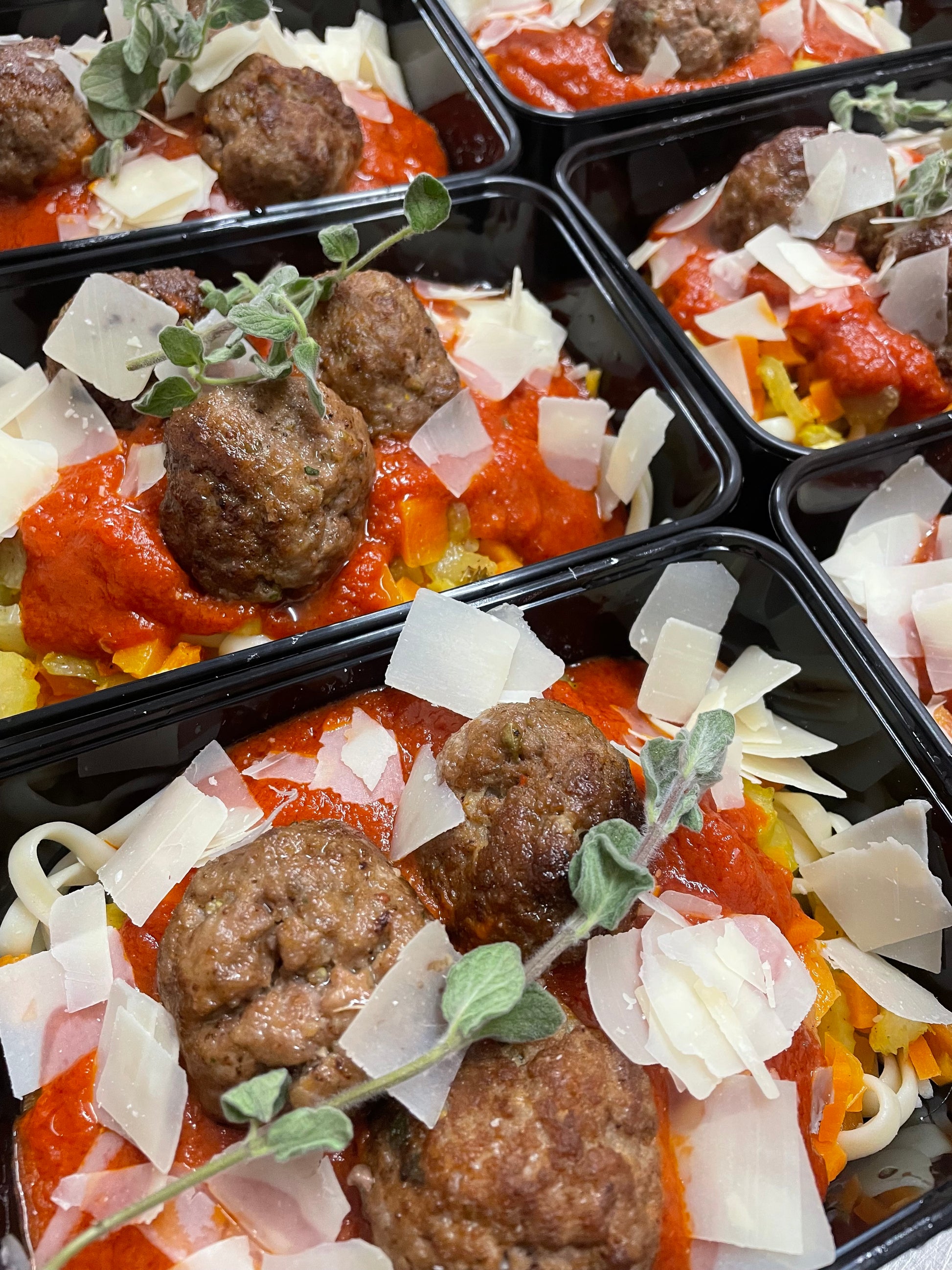 Handgedraaide 100% kipgehaktballetjes, met gekookte linguine pasta een huisgemaakte saus van gebakken sjalot met knoflook, tomatenpuree, afgeblust met kippenbouillon, koksroom, roomkaas, Parmezaanse kaas en zongedroogde tomaatjes, gewokte spinazie en gebakken rode paprika en rode ui, de maaltijd word afgemaakt met verse bieslook