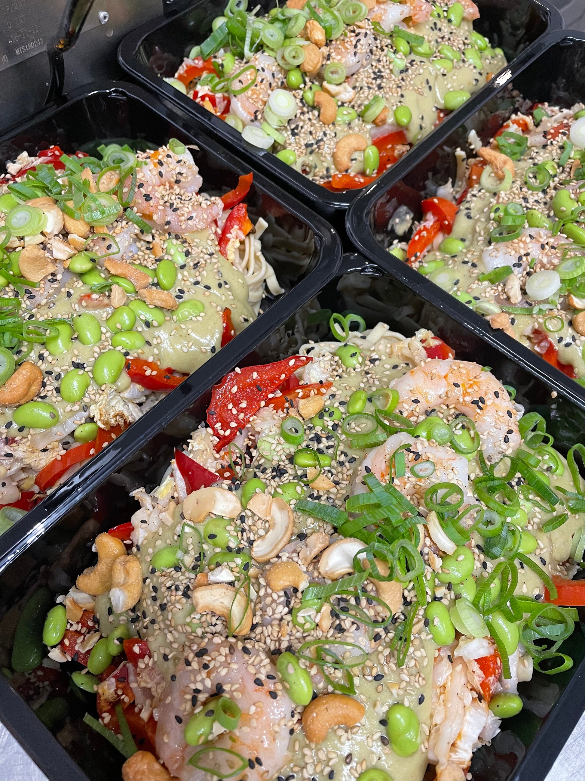 Gebakken reuze scampi's met gekookte jasmijnrijst, een huisgemaakte tom kha kai saus op Thaise wijze : Kokosmelk, rode peper, limoensap, limoenblad, gember, knoflook, citroengras, gembersiroop, donkere sesamolie, gewokte chinese kool, rode paprika, rode uien. De maaltijd word afgemaakt met bosui, sesamzaad, cashewnoten.